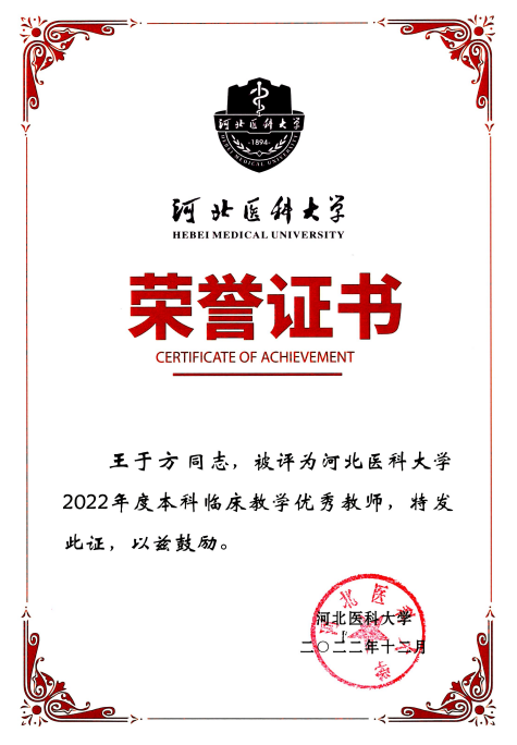 我室王于方老师荣获“河北医科大学在线教学最受学生喜爱教师”及“本科临床教学优秀教师”称号。这是我室在本科生教学中继微课大赛、化学大赛等之后的又一佳绩。